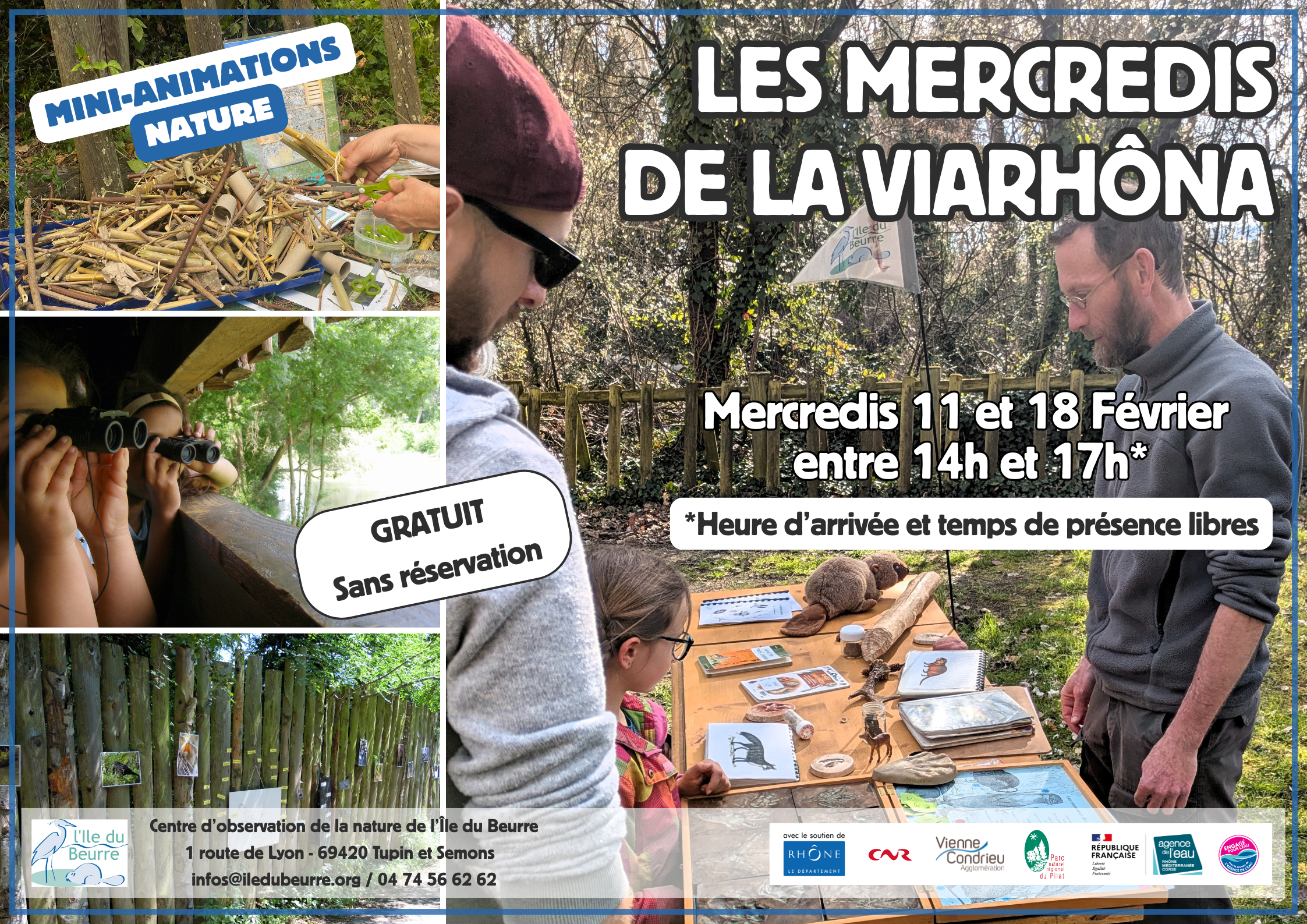 Chaque mercredi après-midi des vacances scolaires, un.e animateur.trice accueille les visiteurs et propose des activités pour découvrir la faune et la flore des bords du Rhône.