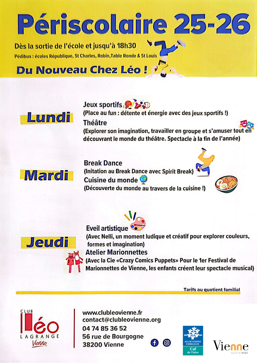 Du lundi au jeudi, des ateliers variés sont proposés aux enfants de 6 à 10 ans, après l'école : jeux sportifs, théâtre, cuisine, break dance, marionnettes, et éveil artistique...