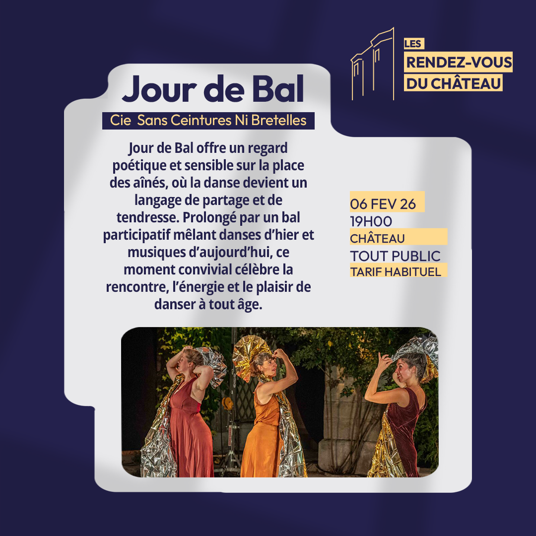 Jour de Bal, par la Compagnie Sans Ceintures ni Bretelles, est un spectacle de danse, suivi d'un bal participatif mêlant danses d'hier et musique d'aujourd'hui.