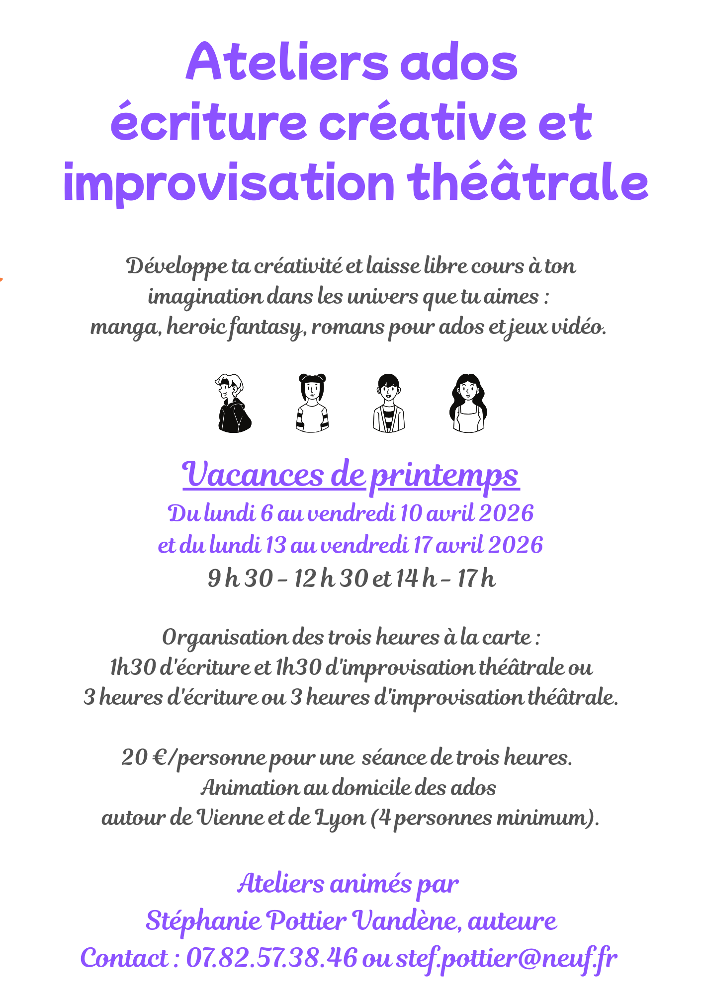 Je me déplace chez vous pour animer pendant trois heures un atelier d'écriture sur le thème choisi par votre ado et ses potes, ainsi qu'un atelier d'improvisation théâtrale :