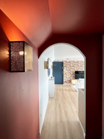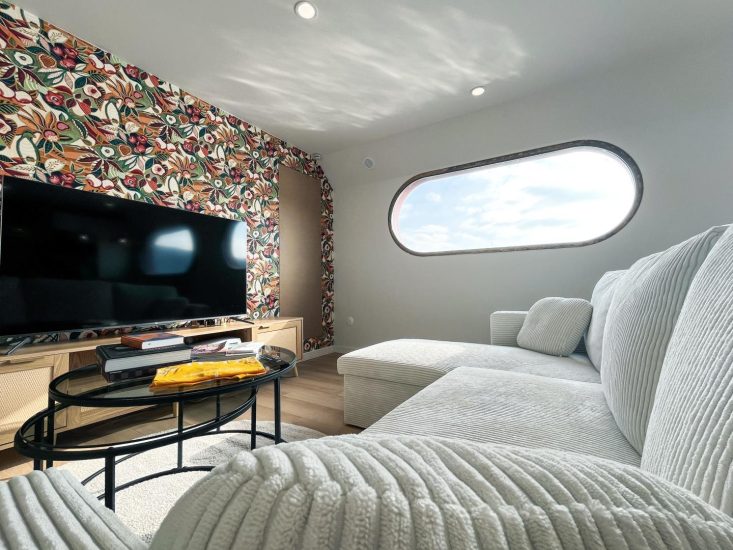 Depuis la passerelle, vous arriverez sur une terrasse de 40 m². En descendant quelques marches, vous trouverez un salon lumineux, ouvert sur une cuisine entièrement équipée. L'espace dispose de deux chambres climatisées (10 et 11 m²), avec rangements, et d'une salle d'eau.