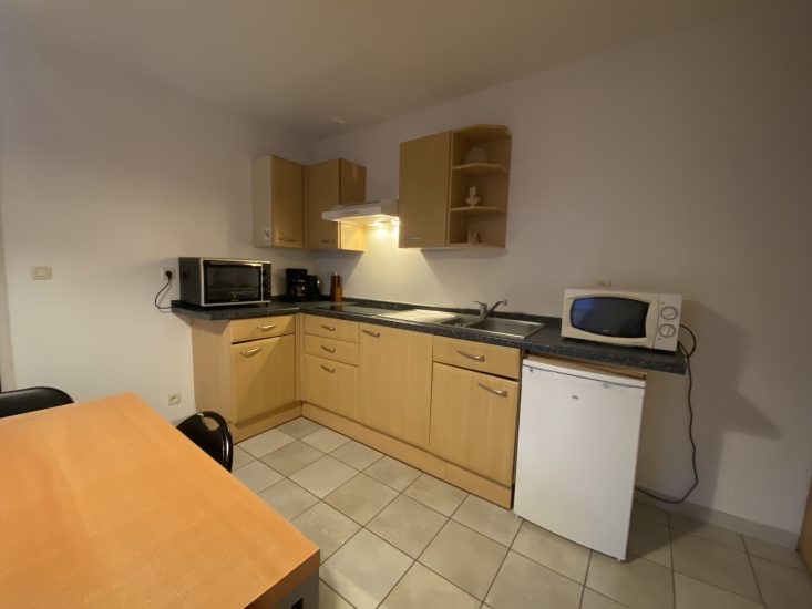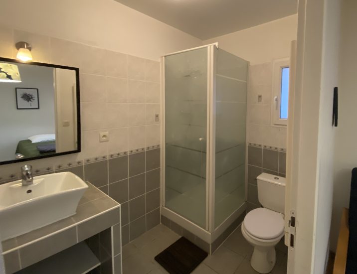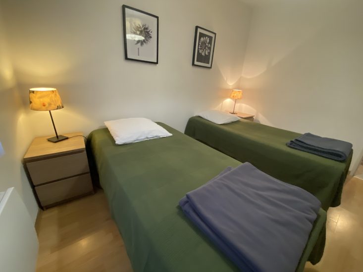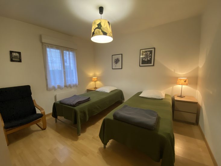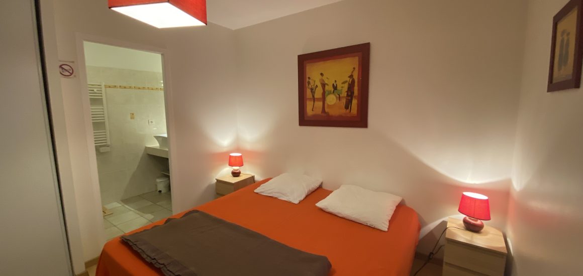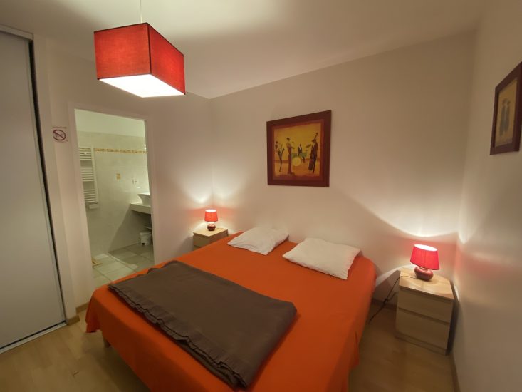 L'appartement de plain pied comprend une pièce principale avec coin cuisine et 2 chambres (possibilité d'avoir un lit double ou 2 lits simples) avec une salle d'eau/toilettes dans chaque chambre.
