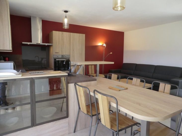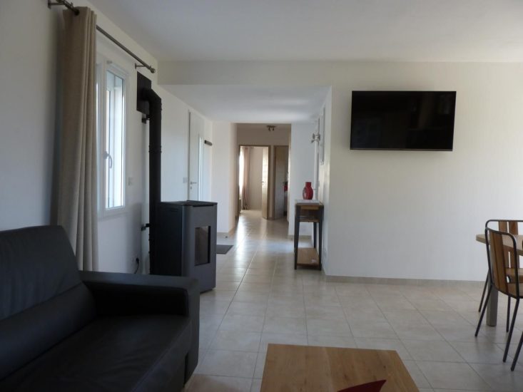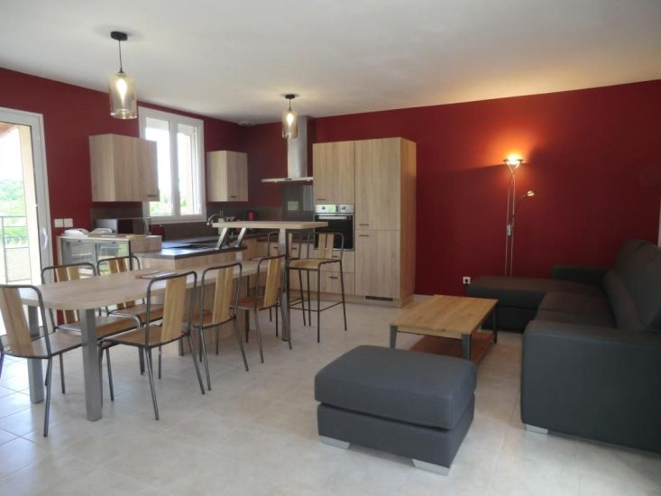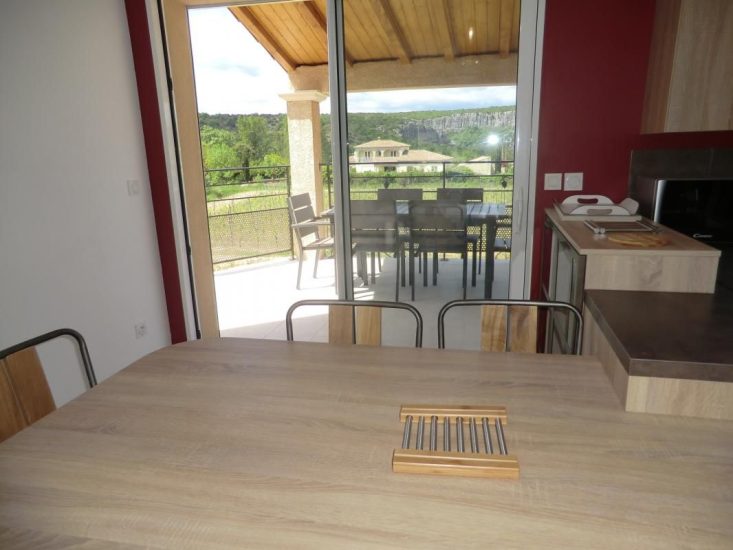 . Pièce à vivre avec coin-cuisine intégré et coin salon avec poêle à granulés, 1 chambre (1 lit 140), 1 chambre (2 lits 80 jumelables en grand lit 160, 1 lit en 90), salle d'eau avec grande douche italienne et WC. Très jolie vue sur le cirque de Gens (Falaises surplombant l'Ardèche, grand site classé d'escalade Français). Piscine du propriétaire commune avec le 1er gîte accessible de 10h à 12h et de 14h à 20h. Tous commerces et activités à Ruoms situé à 5 min du gite.