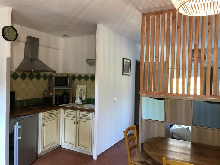 Le Gîte Basilic est composé d'un espace chambre avec un lit en 160 cm, d'une cuisine équipée ouverte sur un séjour avec un Bzed en 140 cm. Il y a également une salle de bain avec un lavabo, une douche et des toilettes séparées.