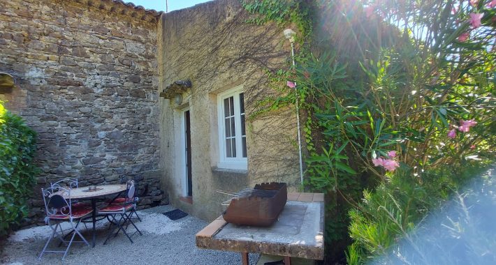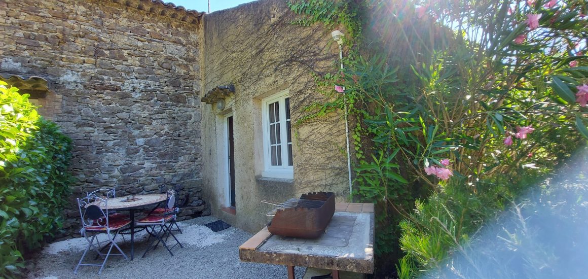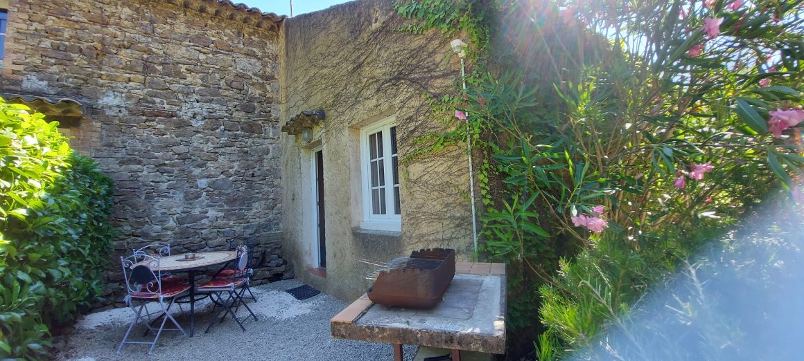 La terrasse est privative et aménagée avec une table, des chaises et un barbecue.