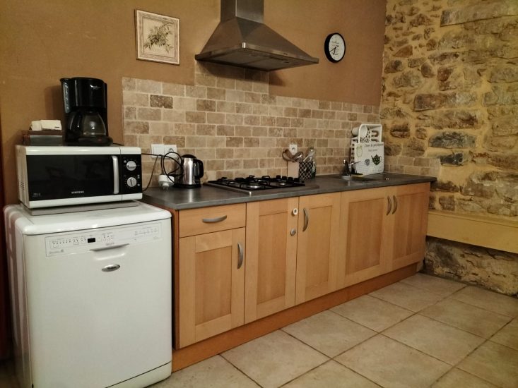 Le gîte Romarin est composé d'une chambre avec un lit en 140 cm, de une alcôve avec 1 lit en 90 cm et une alcôve avec un lit en 140cm, d'une cuisine équipée ouverte donnant sur un séjour équipée d'un clic-clac en 140. Il y a également une salle de bain avec un lavabo, une douche et des toilettes séparées.