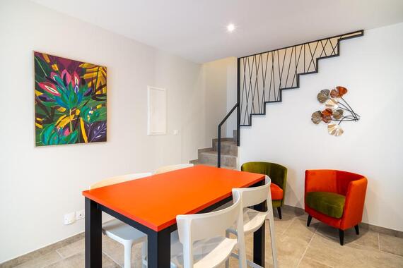 L'entrée indépendante vous guide vers une petite cuisine bien équipée, avec une table et quatre chaises au rez-de-chaussée, ainsi que deux petits fauteuils et une machine à laver. Les toilettes sont également situées à ce niveau.