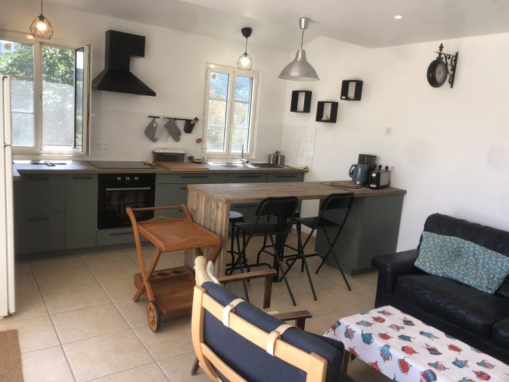 Gîte de 4/6 personnes composé d'une chambre avec lit double en 140, une chambre avec un lit double en 140 et deux lits superposés, une pièce de vie avec terrasse, piscine.