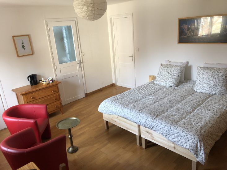 La chambre non-fumeur peut accueillir au maximum deux adultes (couchage individuel avec deux lits en 90 ou couchage en couple avec un lit en 180, à choisir au moment de la réservation) et un bébé dans un lit parapluie mis à disposition.