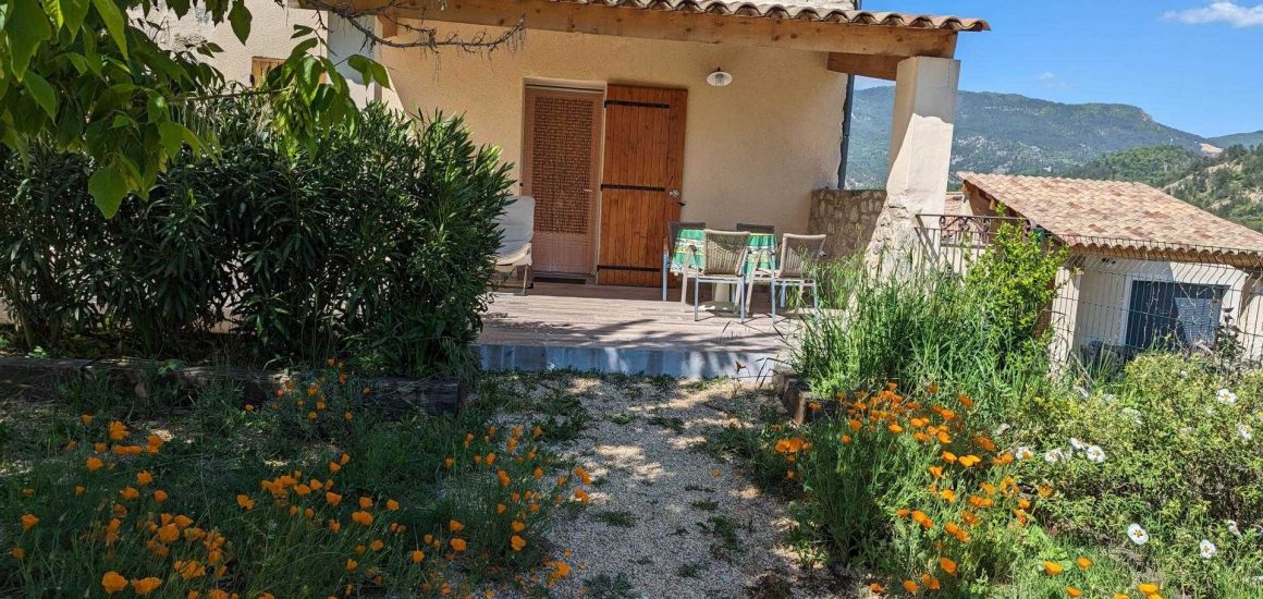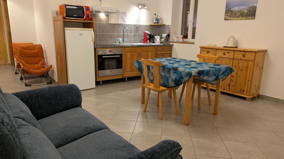 Gîte de plain-pied mitoyen à un autre gîte : cuisine séjour et coin salon avec canapé, 1 chambre (1x160), salle d'eau avec douche à l'italienne, wc indépendant. Terrasse semi-couverte.