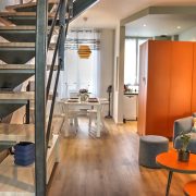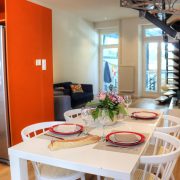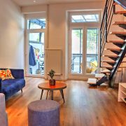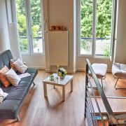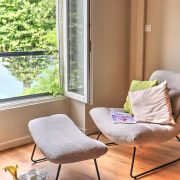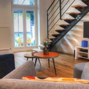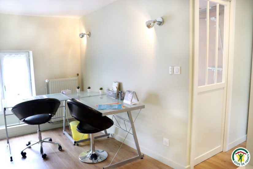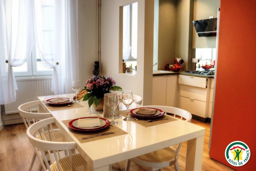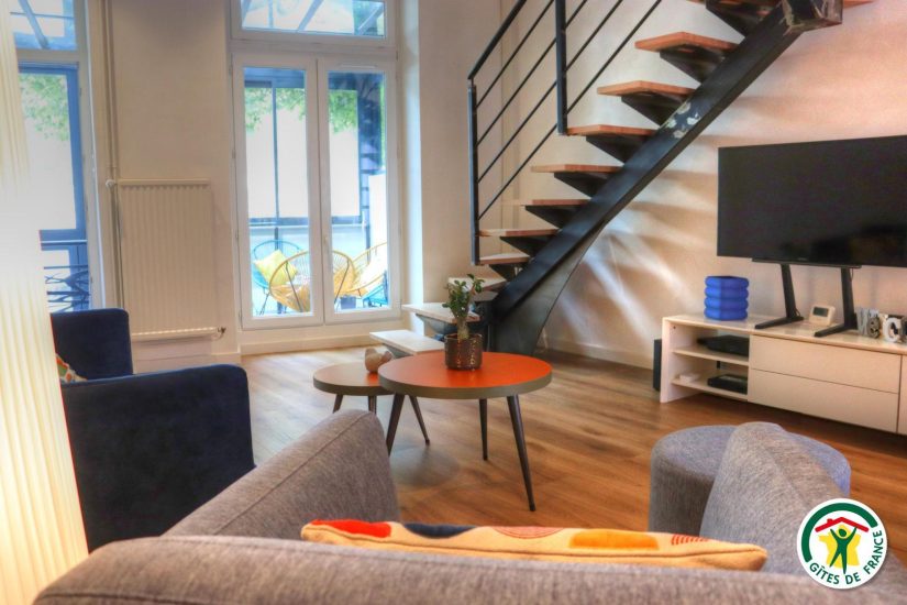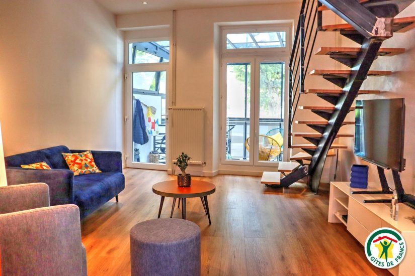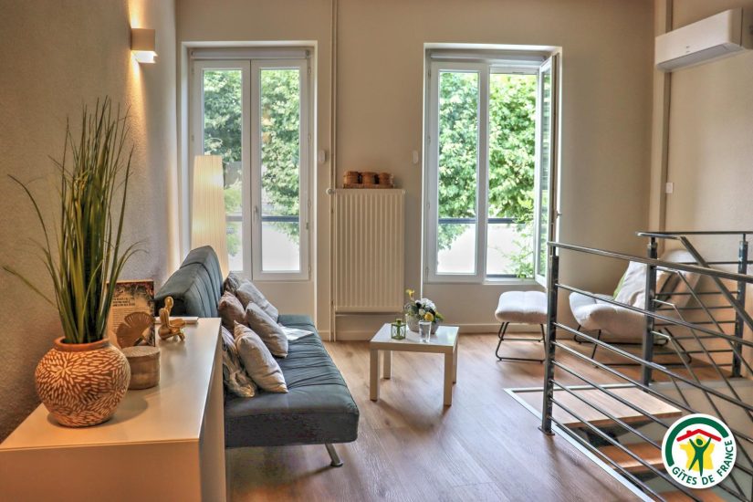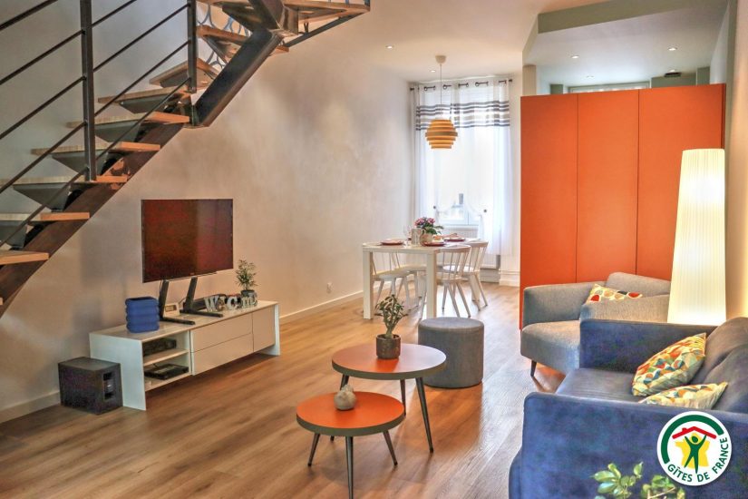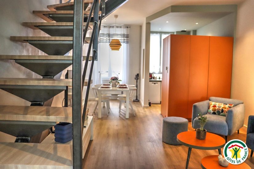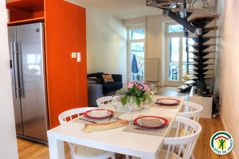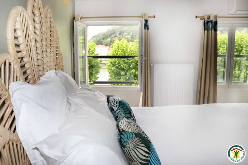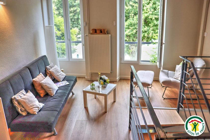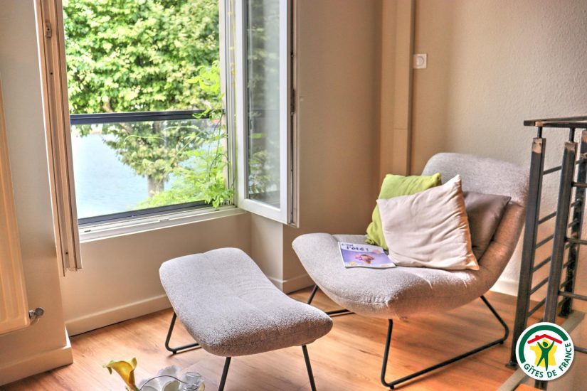 Gîte en centre-ville situé sur 3 niveaux avec accès par un escalier pour entrer dans la véranda. Grande pièce de séjour avec coin cuisine au rez de chaussée. Au premier étage, salon TV et Home Cinéma avec une chambre 2 personnes avec lit en 140x190, salle de bain et WC privatifs, au deuxième étage, un bureau avec jeux de société et une seconde chambre avec lit 2 personnes en 140x190, salle d'eau privative avec WC. Terrasse de la véranda donnant sur le fleuve. Garage privatif en sous-sol.