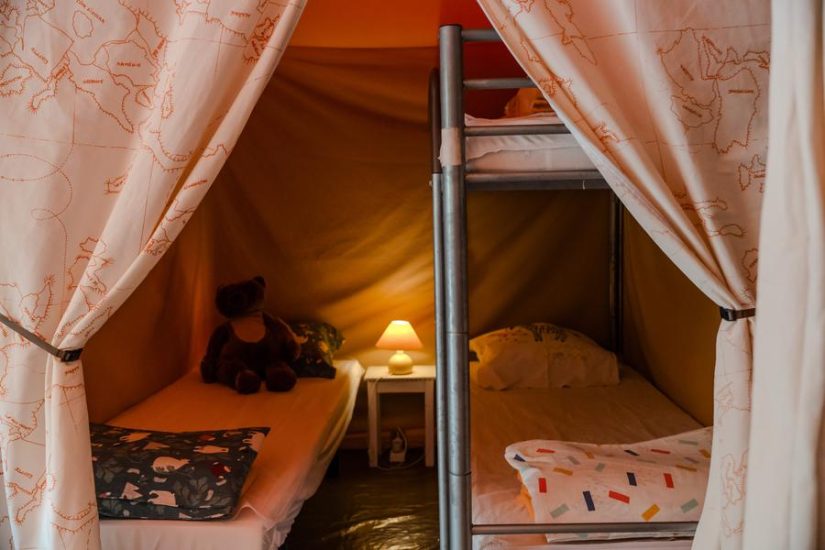 2 chambres totalement séparées : 1 lit 140x190, chevet et lampe. La seconde avec 2 lits superposés 80x190 et 1 lit 70x140 le tout avec sommiers, alèses, oreillers et couvertures, rangement. utilisation des sanitaires du camping.