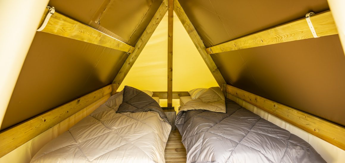 La tente Trek Duo est pensée pour proposer une expérience en tente équipée avec le charme d’un lodge au plancher bois et le minimum de confort : petite terrasse couverte avec table pique-nique et coin cuisine, branchement électrique individuel.