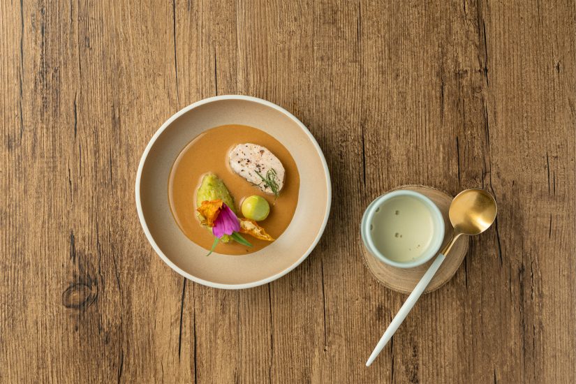 La démarche culinaire repose sur une forte sensibilité au vivant, avec un travail approfondi du végétal, des assaisonnements, des textures et des cuissons. Le Chef s’inspire également des principes de la cuisine Kaiseki, accordant une attention particulière à la saisonnalité, à l’équilibre entre les mets et à la progression du repas.